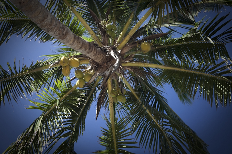 The home of the coconut palm is thought to be Polynesia, though some authorities argue that it originates from South America. It is often the first glimpse of the tropics for the traveler as it is almost entirely restricted to coastal regions. Its buoyant fruits have been proven to drift up to 4500 km with the help of ocean currents and still remain viable.